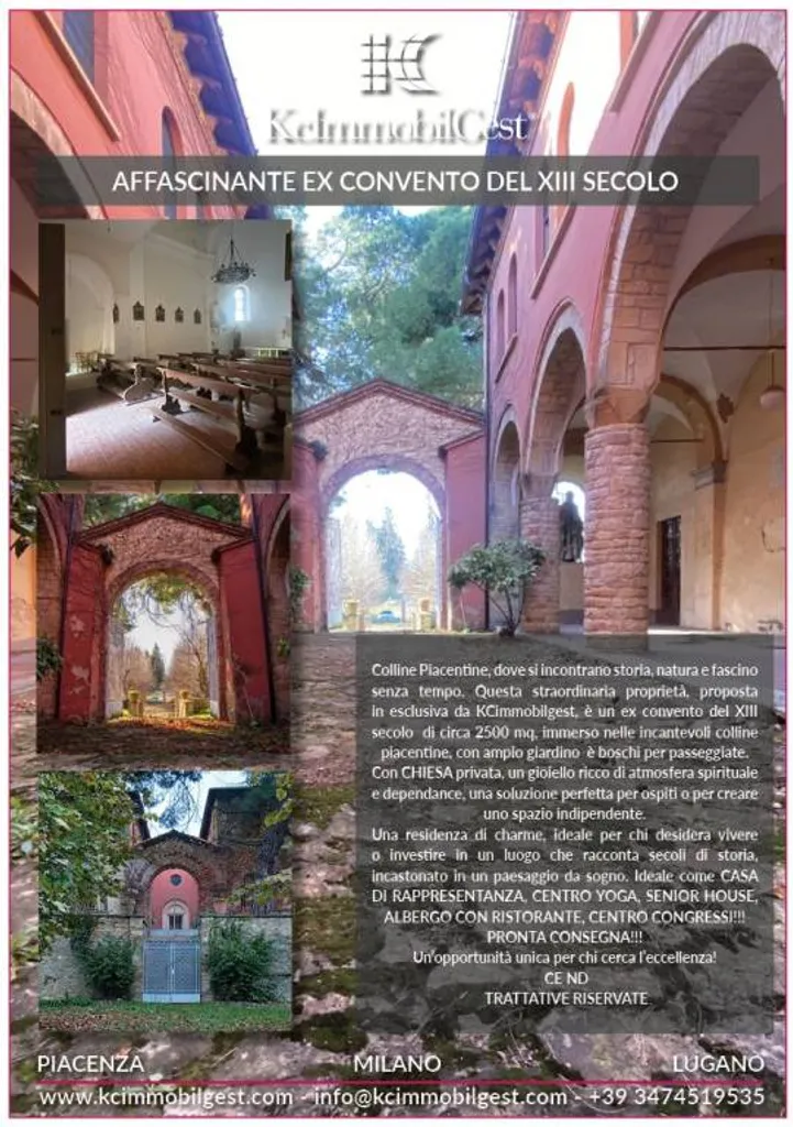Rif. 0379 - AFFASCINANTE EX CONVENTO DEL XIII SECOLO Colline Piacentine, dove si incontrano storia, natura e fascino senza tempo Questa straordinaria proprietà, proposta in esclusiva da KCIMMOBILGEST, è un ex convento del XIII secolo di circa 2500 mq, immerso nelle incantevoli colline piacentine, con ampio giardino e boschi per passeggiate. Con CHIESA privata, un gioiello ricco di atmosfera spirituale e dependance, una soluzione perfetta per ospiti o per creare uno spazio indipendente. Una residenza di charme, ideale per chi desidera vivere o investire in un luogo che racconta secoli di storia, incastonato in un paesaggio da sogno. Ideale come CASA DI RAPPRESENTANZA, CENTRO YOGA, SENIOR HOUSE, ALBERGO CON RISTORANTE, CENTRO CONGRESSI!!!! PRONTA CONSEGNA!!!! Un'opportunità unica per chi cerca l'eccellenza! www.kcimmobilgest.com CE ND, TRATTATIVE RISERVATE